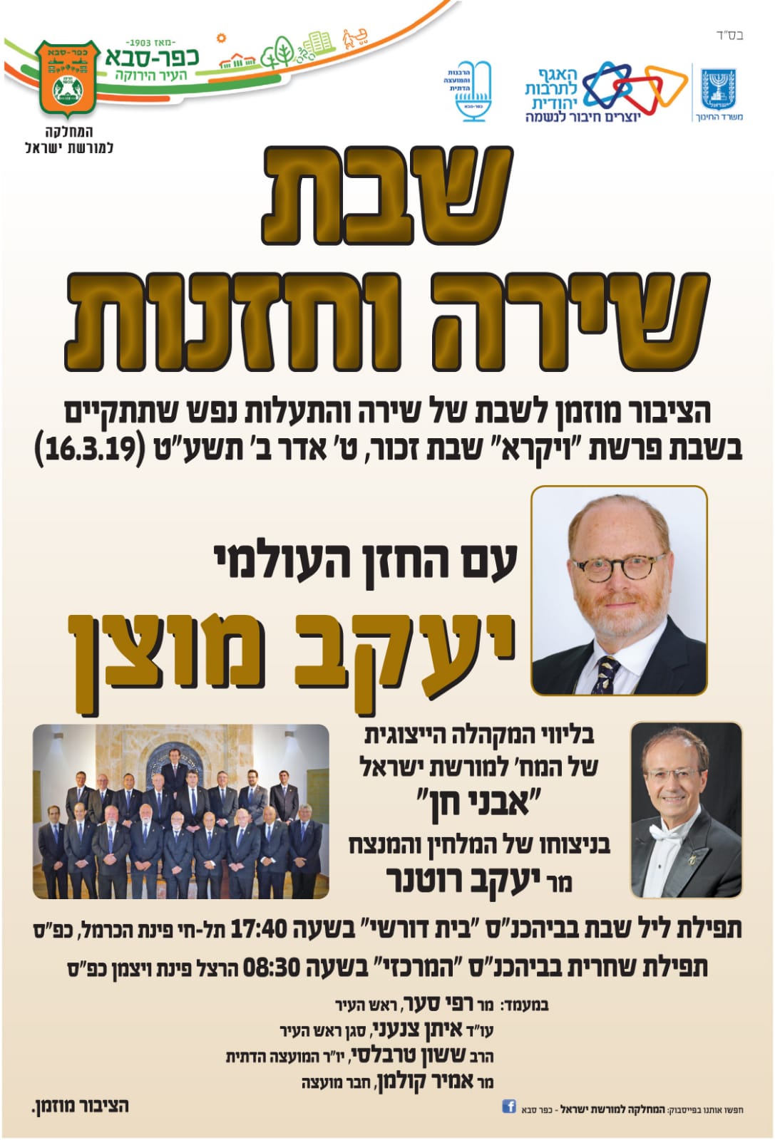 בשבת זכור, פרשת ויקרא, ט׳ אדר ה׳תשע״ט, 15-16/3/2019, תתקיים בכפר סבא אי״ה שבת שירה וחזנות עם החזן יעקב מוצן, ובליווי המקהלה הייצוגית של המחלקה למורשת ישראל ״אבני חן״ בניצוחו של המלחין והמנצח יענקל׳ה רוטנר.