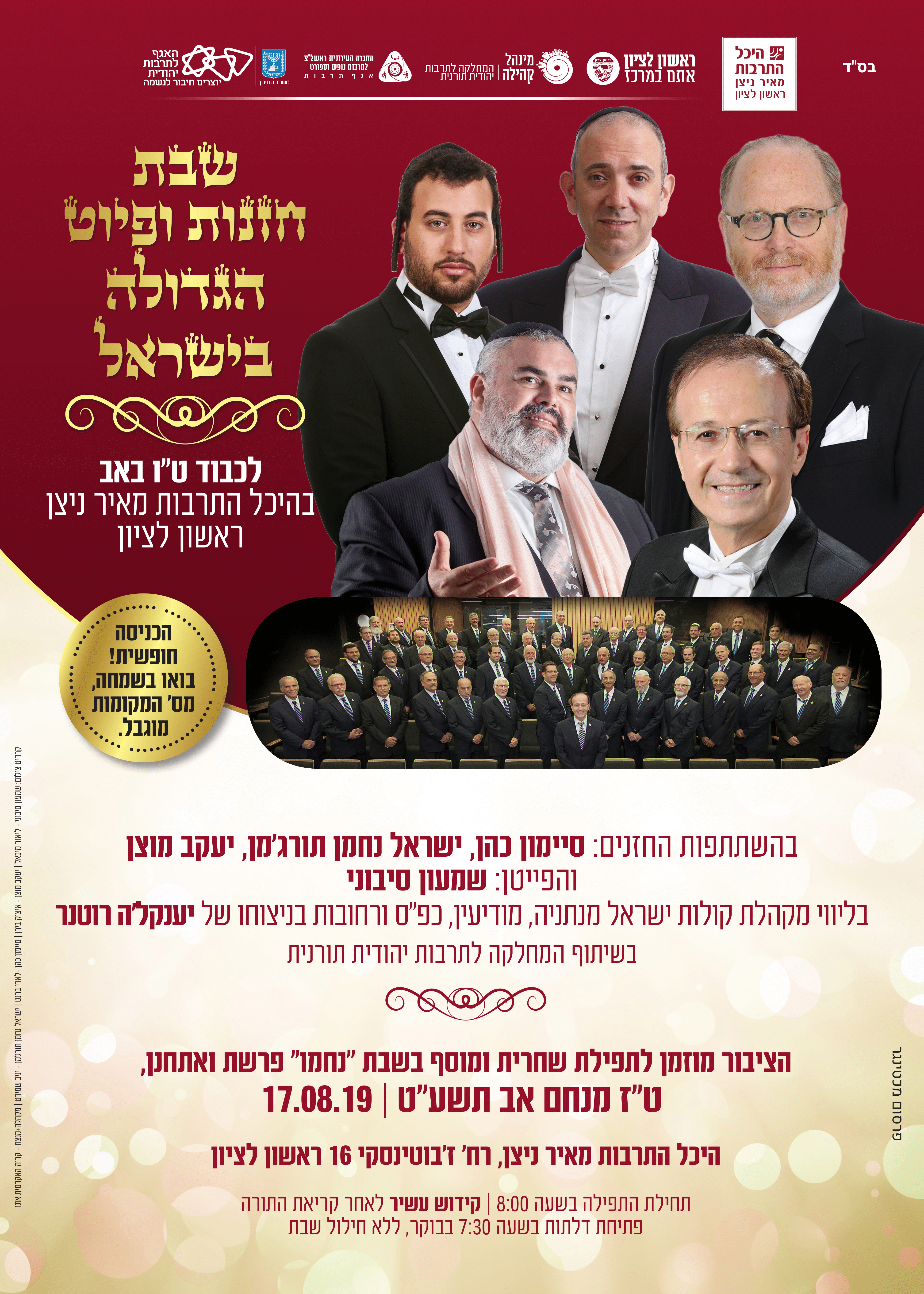 בשבת נחמו, פרשת ואתחנן, ט״ז באב ה׳תשע״ט, 17/8/2019, תתקיים בראשון לציון תפילת שחרית ומוסף חגיגית לכבוד ט״ו באב בהשתתפות טובי החזנים והפייטנים ובליווי מקהלת ענק. התפילה תתקיים בהיכל התרבות מאיר ניצן ללא חילול שבת (הכניסה חופשית!).